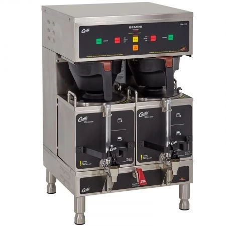 Gemini® Coffee Brewer, Twin, 1.5 Gallon, 3 Phase, automatic, analog, 12 or 24 cup brew/batch, 17.5 gallons per hour, 5.2 gallon tank volume, fresh brew, hot water faucet, plastic brew basketstainless steel, 220v/50/60/3-ph, 6300 watts, 17.0 amps, 1 GPM, (2) 3W+G, 20-90 psi, 3/8″ Flare fitting, cULus, NSF.